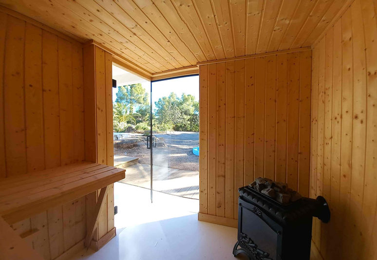 La villa et ses annexes sont rénovées dans le même style et se situent sur une esplanade au cœur d'un bois laissé à l'état sauvage. Il y a un sauna au feu de bois, une salle de gym, un atelier/garage, une piscine, un cour de tennis, un vergé d'arbres fruitiers, un potager en système de permaculture et un étang.